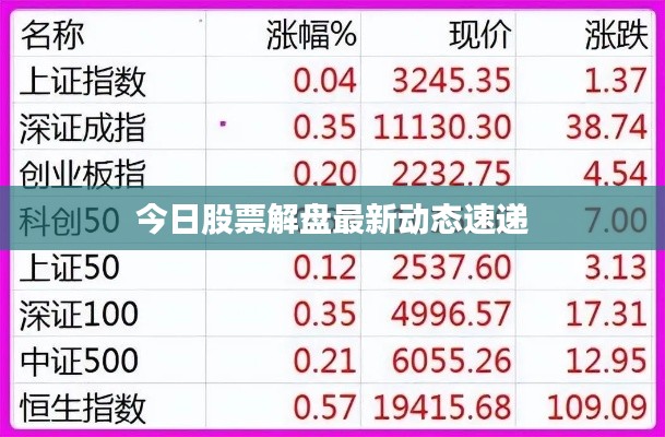 随着市场的不断变化,投资者对于股票信息的掌握变得越来越重要,本文将结合最新的消息,对今日股市进行解读,帮助投资者更好地把握市场动态。