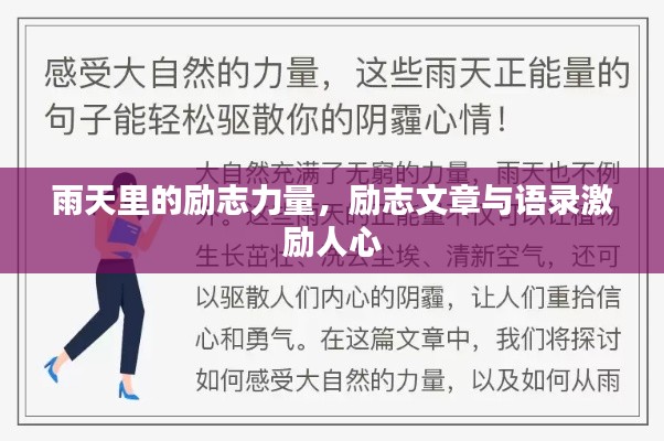 雨天,是一种独特的气氛,它带来了宁静与深思,在这湿润的环境中,人们更容易感受到生活的起伏与变化,我们将一起探索雨天的励志力量,通过一系列励志语录,激发你面对生活的勇气与决心。
