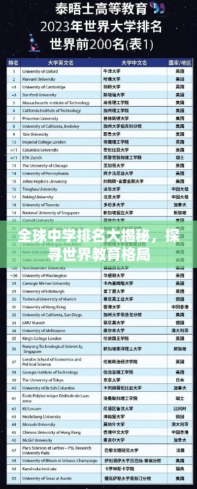 随着全球化的步伐不断加快,教育领域的国际竞争也日益激烈,中学教育作为人才培养的重要阶段,其质量直接关系到国家的未来和竞争力,本文将探讨世界所有中学的排名情况,揭示全球教育的格局和发展趋势。