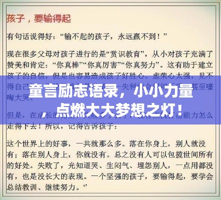 童言励志语录,简单却充满力量,它们像一盏明灯,照亮我们前行的道路,让我们一起聆听这些小小的声音,感受那份大大的力量,让我们一起勇往直前,追求我们的梦想,因为,我们都是梦想家,我们都有梦想,我们要为之努力,为之奋斗,童言励志语录,让我们在人生的旅途中,始终保持一颗勇敢、坚韧、善良的心。