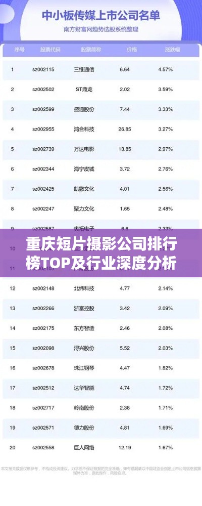 随着视觉艺术的繁荣和数字化时代的到来,短片摄影和影像制作行业在中国市场呈现出蓬勃的发展态势,特别是在重庆市,众多短片摄影公司如雨后春笋般崭露头角,本文将为您介绍重庆短片摄影公司的排名及相关行业分析。
