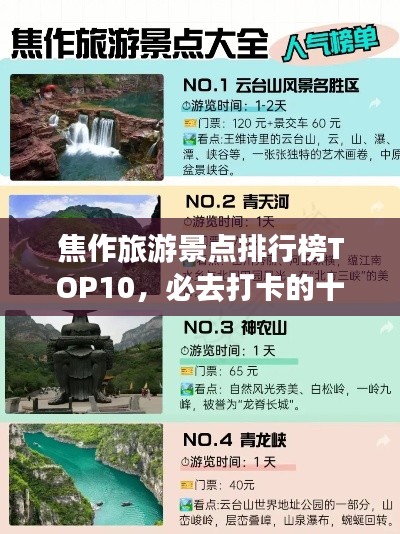 焦作市拥有丰富的旅游资源,以上景点排名前十名,每个景点都有其独特的魅力和特色,无论是自然风光还是历史文化,都能让游客在这里找到自己喜欢的旅游项目,来焦作旅游,你一定能感受到大自然的魅力和历史文化的底蕴。