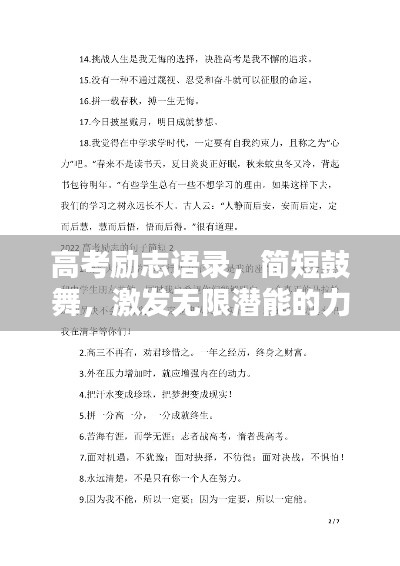 高考,是每个学子人生旅途中的一座重要山峰,面对这座山峰,我们不仅需要扎实的学识,更需要坚定的信念和毅力,在这篇文章中,我们将为你带来一系列简短而鼓舞人心的高考励志语录,助你攀登这座高峰,实现自己的梦想。