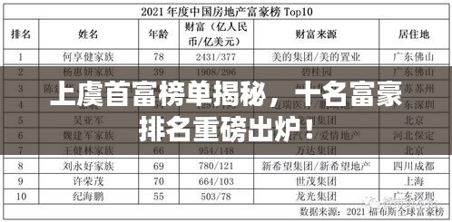 上虞市位于浙江省绍兴市东部,是一个经济发达、充满活力的地区,近年来,上虞市的经济持续增长,涌现出了一批杰出的企业家和富豪,本文将为您揭晓上虞首富十名的排名,带您了解这些成功人士的传奇故事。
