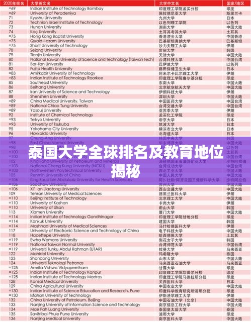 随着全球化的推进,教育领域的国际交流与合作日益频繁,世界各国大学的排名也备受关注,泰国作为东南亚的重要国家,其教育事业的发展也备受瞩目,本文将探讨泰国大学的世界排名以及其在全球教育领域的地位。