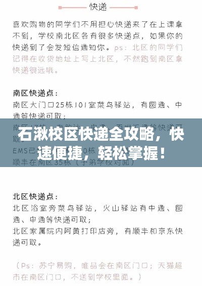 随着电子商务的飞速发展,快递服务已成为大学生活中不可或缺的一部分,对于在南京石湫校区就读的同学们来说,了解最新的快递攻略,将极大提高大家的生活效率,本文将为大家详细介绍石湫校区的快递服务情况,包括快递网点分布、寄取件流程、注意事项等,希望能为大家的校园生活带来便利。