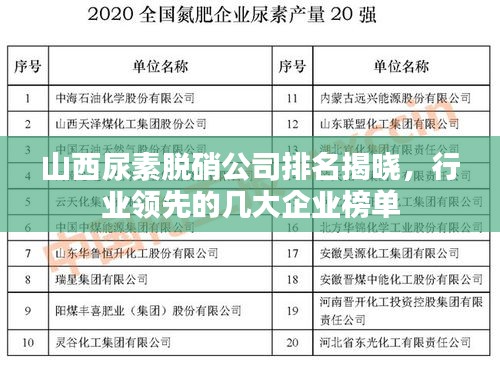 随着环保意识的日益增强和环保政策的不断升级,尿素脱硝技术已成为国内许多企业应对环保压力的重要手段之一,在山西省,众多尿素脱硝公司也应运而生,为保护环境、推动经济发展做出了积极贡献,本文将介绍山西尿素脱硝公司的排名,以便为需要选择合作伙伴的企业提供参考。
