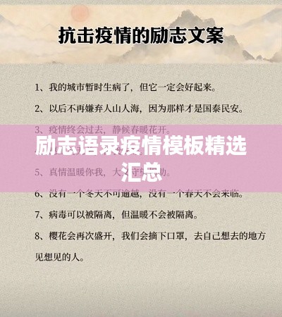面对疫情,我们要坚定信心,保持乐观心态,共同抗击疫情,每一个努力的日子,都是为了迎接更好的明天,让我们携手同行,共克时艰,战胜疫情,在疫情期间,合理安排时间,保持工作与学习的平衡,不断成长和进步,相信我们一定能取得胜利,迎接美好的未来,这些励志语录与图片模板,希望能为大家带来正能量和鼓舞,共同度过这段特殊时期。